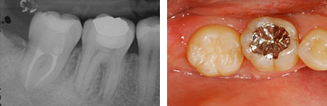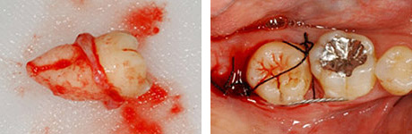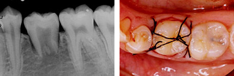 適切な条件がそろえば、歯の移植が可能です。歯の移植とは、治療することができない歯を抜いて、その場所へ本人の親知らずなどの歯を移す治療です。例えば、下のパノラマエックス線写真は18歳の男子です。右下の第一大臼歯が割れて痛みを伴って来院されました。この歯の保存できないと判断して、その歯を抜歯し,後ろにあるまだ生えていない親知らずをそこへ移植しました。移植の適切な条件とは、患者さん年齢が概ね40歳以下であること、口腔内に適切なドナー歯(主に親知らず)があること、移植歯(ドナー歯)と移植部位(受容側)の大きさが適合すること、などです。