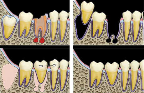 適切な条件がそろえば、歯の移植が可能です。歯の移植とは、治療することができない歯を抜いて、その場所へ本人の親知らずなどの歯を移す治療です。例えば、下のパノラマエックス線写真は18歳の男子です。右下の第一大臼歯が割れて痛みを伴って来院されました。この歯の保存できないと判断して、その歯を抜歯し,後ろにあるまだ生えていない親知らずをそこへ移植しました。移植の適切な条件とは、患者さん年齢が概ね40歳以下であること、口腔内に適切なドナー歯(主に親知らず)があること、移植歯(ドナー歯)と移植部位(受容側)の大きさが適合すること、などです。