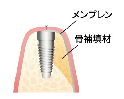 GBRはインプラント治療に必要な骨が足りない部分に行う「骨誘導再生法」です。目的の箇所に骨補填材を入れてメンブレンという膜で覆うことで、骨を再生したい部分によけいな細胞が入り込まないので、インプラントに必要な骨を効率よく再生できます。