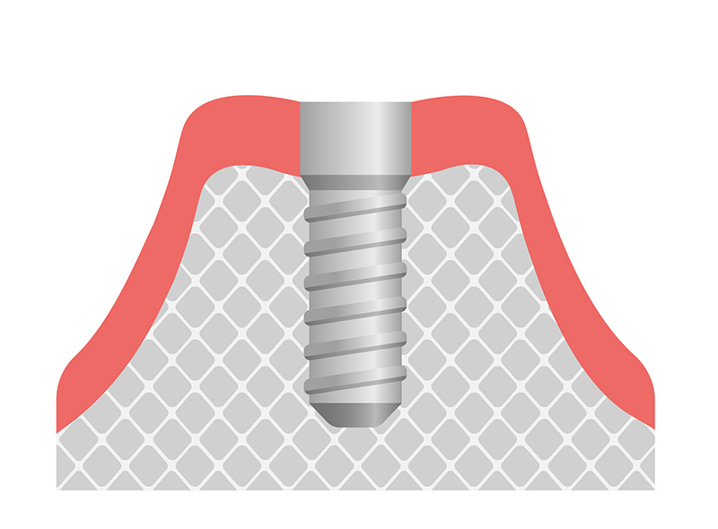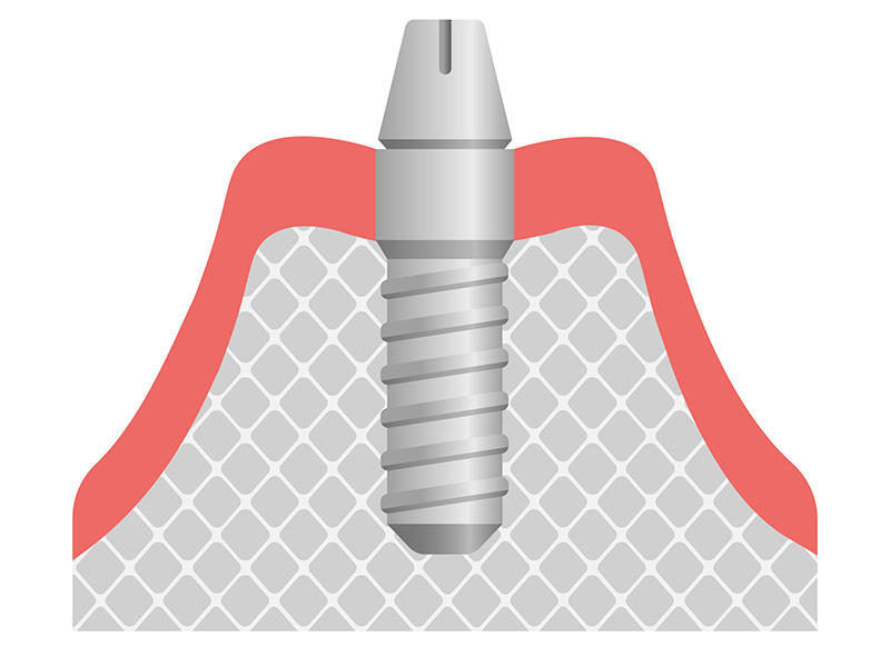 まず麻酔を行ってから、歯肉を切開して計画した部分の顎の骨に穴をあけます。それからインプラント体を埋め込み、歯肉を戻して縫合します。このとき、インプラント体を全て埋め込む方法と、インプラント体の一部が歯肉から出た状態にする方法があります。