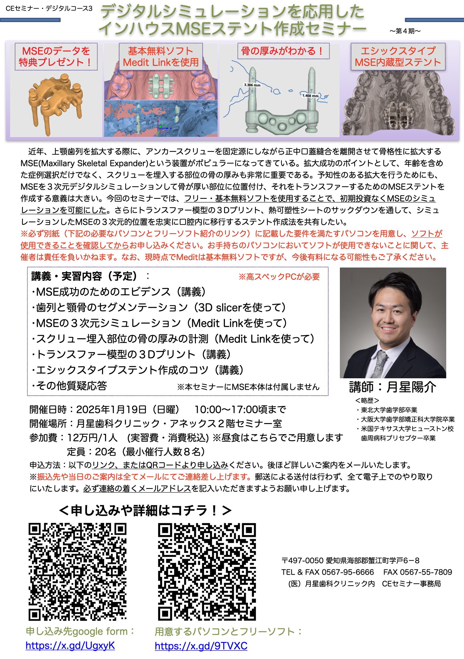 | コース内容 | MSE成功のためのエビデンス(講義) 歯列と顎骨のセグメンテーション(3D slicerを使って) MSEの3次元シミュレーション(Medit Linkを使って) スクリュー埋入部位の骨の厚みの計測(Medit Linkを使って) トランスファー模型の3Dプリント(講義) エシックタイプステント作成のコツ(講義) その他質疑応答 ※本セミナーにMSE本体は付属しません |