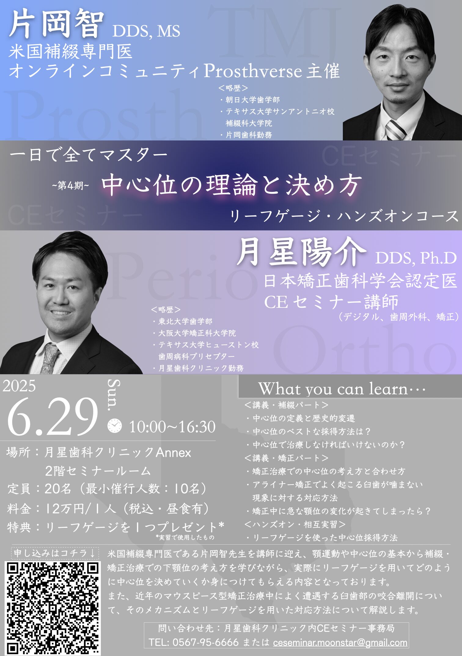 | コース内容 | <講義・補綴パート> 中心位の定義と歴史的変遷 中心位のベストな採得方法は? 中心位で治療しなければいけないのか? <講義・矯正パート> 矯正治療での中心位の考え方と合わせ方 アライナー矯正でよく起こる臼歯が噛まない現象に対する対応方法 矯正中に急な顎位の変化が起きてしまったら? |